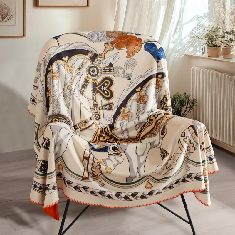 Manta de Viagem e Cama com Efeito de Gravidade, em Veludo Cristal com Estampa de Cavalo e Raposa, em Fleece de Fibra de Poliéster e Elastano, no Estilo Americano e de Luxo Moderno